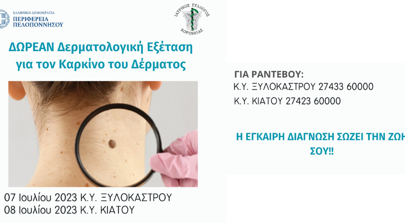 Για αυτόν τον λόγο, επεν­δύ­ο­ντας στη πρό­λη­ψη, ο Ιατρι­κός Σύλ­λο­γος Κοριν­θί­ας σε συνερ­γα­σία με τη Περι­φέ­ρεια Πελο­πον­νή­σου διορ­γα­νώ­νει δρά­ση προ­λη­πτι­κής δερ­μα­το­λο­γι­κής εξέ­τα­σης για τον καρ­κί­νο του δέρ­μα­τος.
