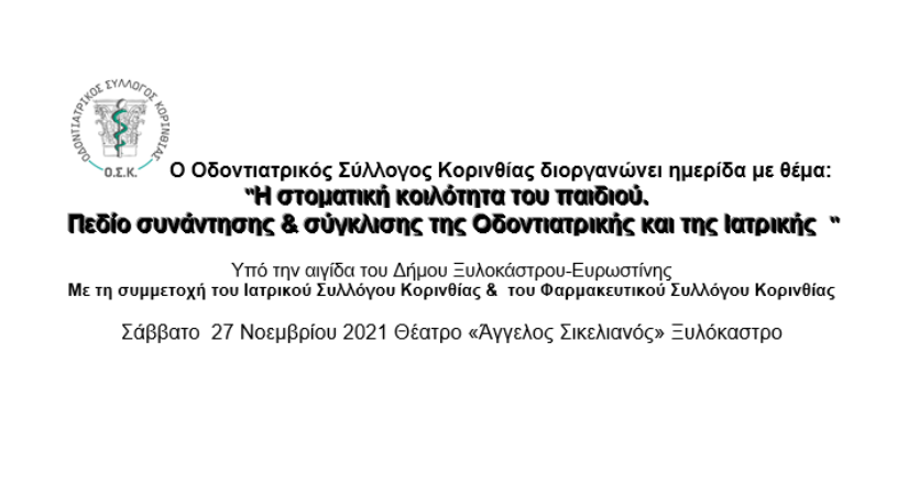 Ο Οδοντιατρικός Σύλλογος Κορινθίας διοργανώνει ημερίδα με θέμα: “Η στοματική κοιλότητα του παιδιού. Πεδίο συνάντησης & σύγκλισης της Οδοντιατρικής και της Ιατρικής”